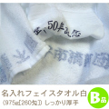 | 製品名 | 名入れフェイスタオル白B品(975g[260匁]) 約34cm×90cm前後 綿100% |