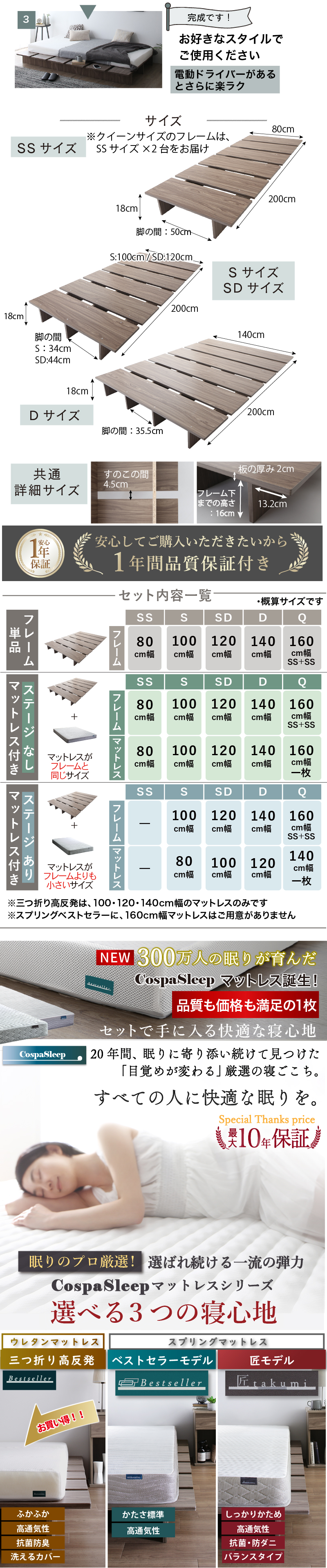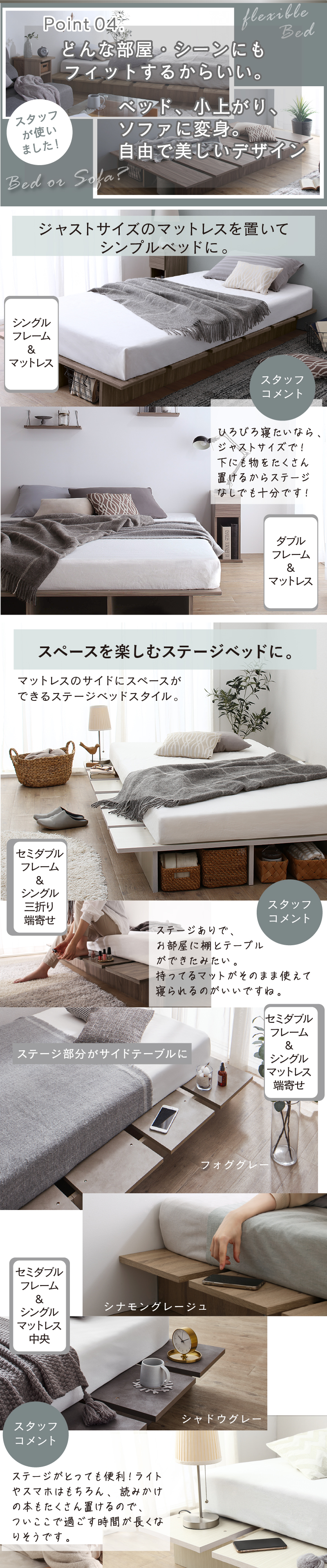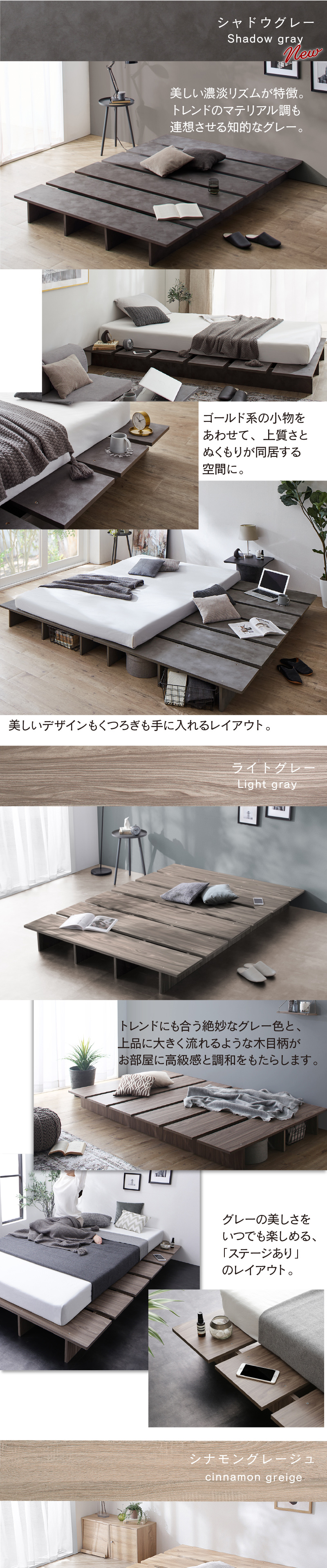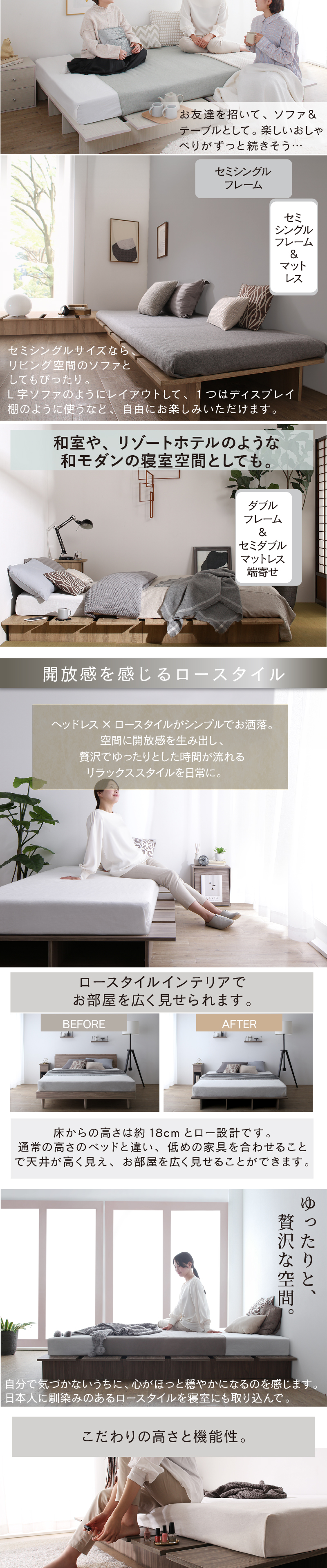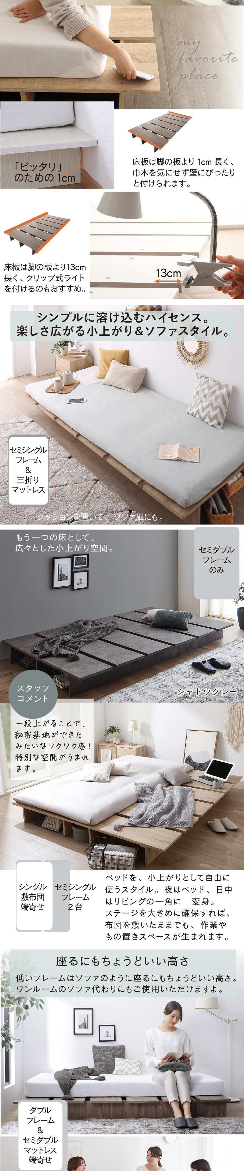 暮らしに寄り添う頑丈すのこ構造ローベッド。おしゃれな天然木調、ベッド・ソファ・テーブル…アイデア次第で自分らしく自由に使える。長く使えて衝撃プライス。ステージベッド フロアベッド ★こちらのページは【セミダブル/ ステージ有/匠マットレス付/組立設置】です。